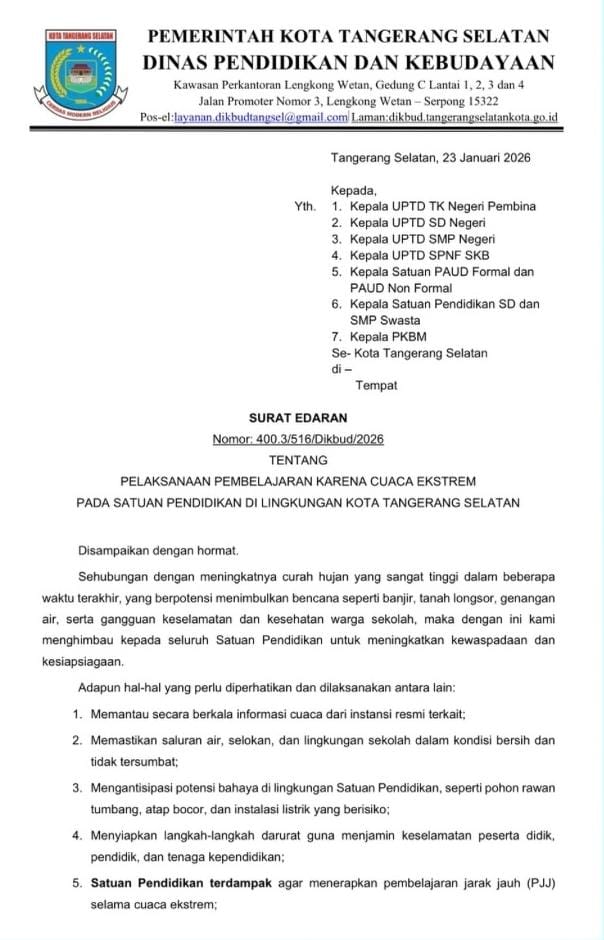 TANGERANG SELATAN, deliksatucomDinas Pendidikan dan Kebudayaan (Disdikbud) Kota Tangerang Selatan (Tangsel) menerbitkan Surat Edaran Nomor 400.1/516/Disdikbud/2026 terkait pelaksanaan pembelajaran pada satuan pendidikan akibat cuaca ekstrem.