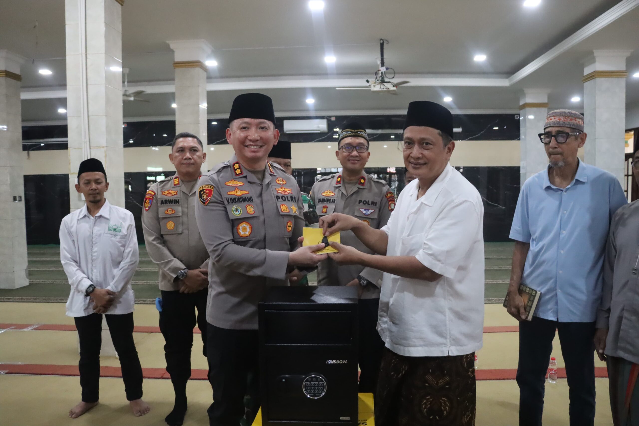 Kapolres menyerahkan satu unit safe deposit box yang difungsikan sebagai kotak amal. Selain itu, bantuan berupa paket sembako dan Al-Qur’an juga diberikan kepada pihak masjid.