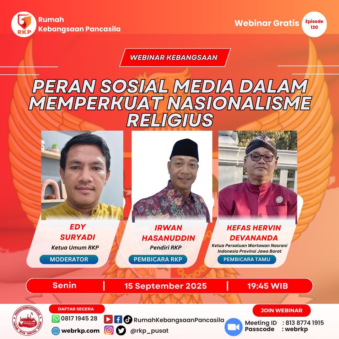 BOGOR, deliksatu.com –  Pada hari Senin, 15 September 2025, pukul 19:45 WIB, Rumah Kebangsaan Pancasila (RKP) mengadakan diskusi menarik dengan tajuk “Peran Media Sosial dalam Memperkuat Nasionalisme Religius” sebagai episode ke-130 dari seri webinar kebangsaan mereka. Diskusi yang dihadiri oleh 150 peserta dari seluruh Indonesia ini menunjukkan tingginya minat dan kesadaran masyarakat akan pentingnya nasionalisme religius di era digital.