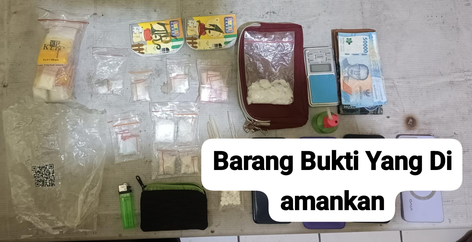Selain itu, petugas juga menyita alat hisap sabu (bong), tiga unit ponsel, serta dua buku catatan kecil yang diduga berisi pembukuan transaksi narkoba. Total barang bukti yang diamankan mencapai 10 paket sabu dengan berat bruto 82,17 gram.
