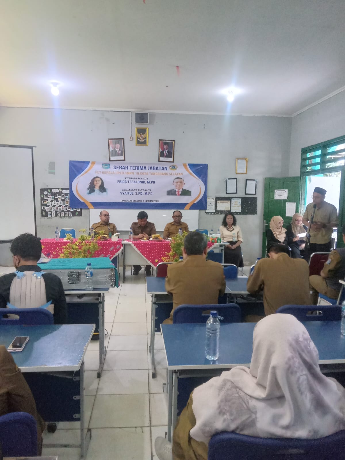 Dalam acara tersebut, jabatan Kepala SMPN 19 Tangsel secara resmi diserahterimakan dari Frida Tesalonik, M.Pd kepada Saipul, S.Pd., M.Pd. Frida Tesalonik diketahui telah memasuki masa purna bakti setelah mengabdi selama bertahun-tahun dalam dunia pendidikan, khususnya di lingkungan SMPN 19 Tangsel.
