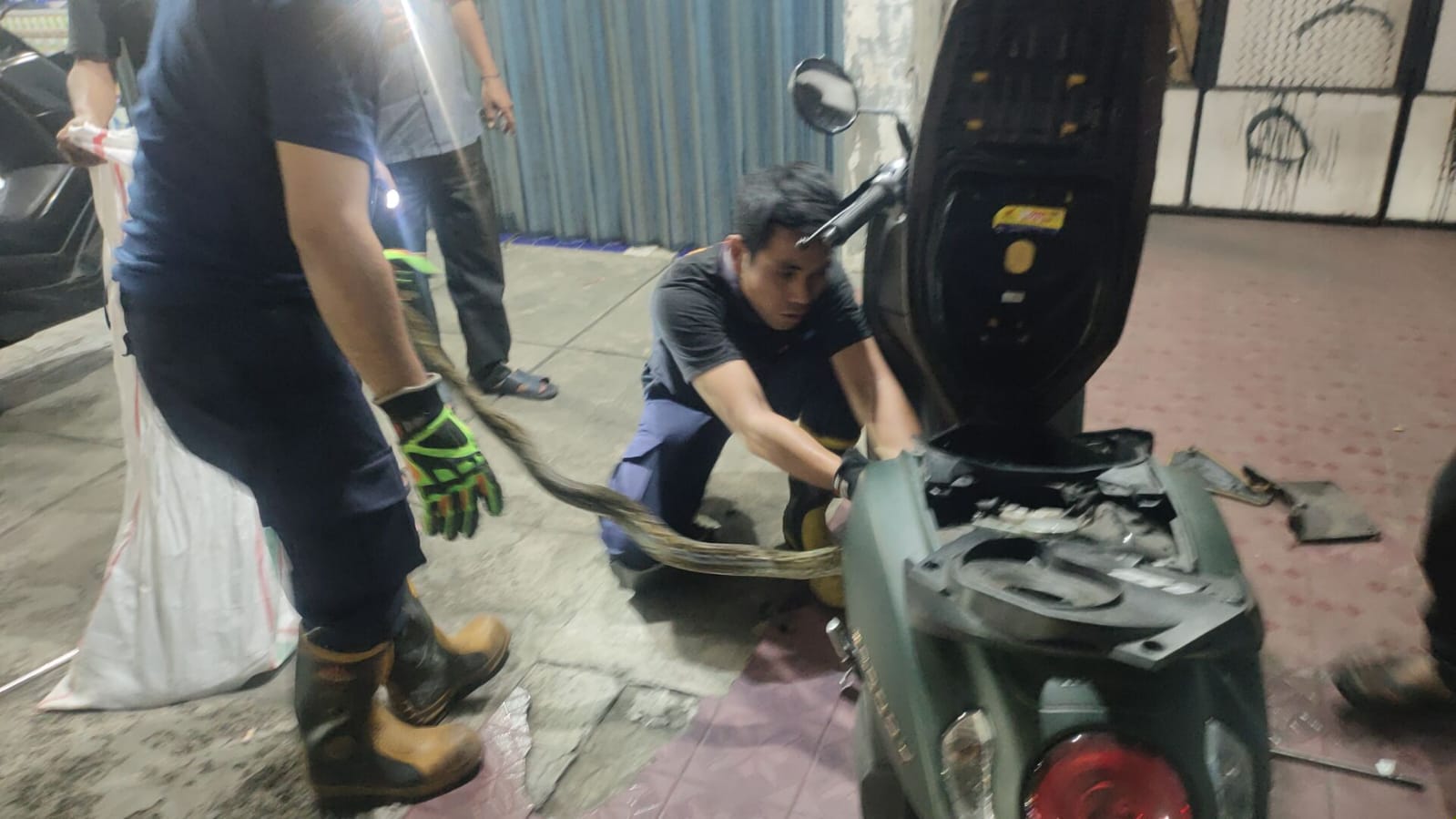 Dua petugas Damkar, Toni Cristian dan Ade Ardela, turun langsung menangani evakuasi. Ular ditemukan melilit erat pada sasis motor sehingga menyulitkan proses penarikan. Karena lilitannya begitu kuat, petugas harus mencari bengkel terdekat untuk membongkar bodi motor.
