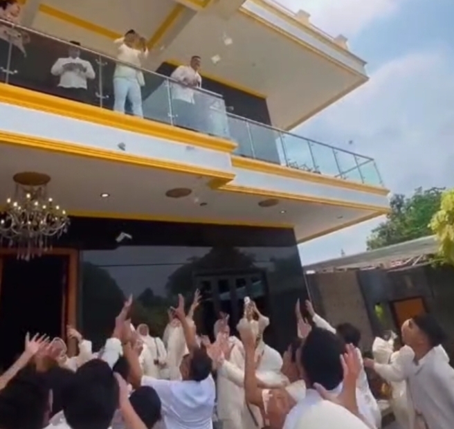 Dalam rekaman yang beredar luas, terlihat aktivitas pembagian uang kepada sejumlah orang di lingkungan rumah berlantai dua tersebut.