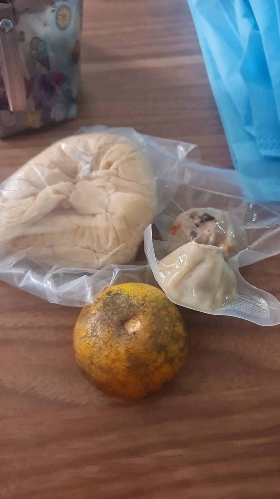 Menu yang dibagikan kepada para siswa terdiri dari dua kotak minuman kemasan (diduga susu), satu buah jeruk, dan satu buah roti.