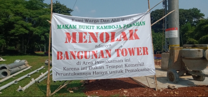 Pantauan Deliksatu.com, Rabu (5/6/2024) spanduk dengan ukuran besar ini dipasang ditengah area Makam Pamahan dengan judul ” Kami Warga Dan Ahli Waris Makam Bukit Kamboja Pamahan Menolak Dengan Adanya Bangunan Tower di Area Pemakaman ini, Karena ini Bukan Tempat Komersil, Peruntukkannya Hanya untuk Pemakaman,” demikian tertulis dalam spanduk itu.